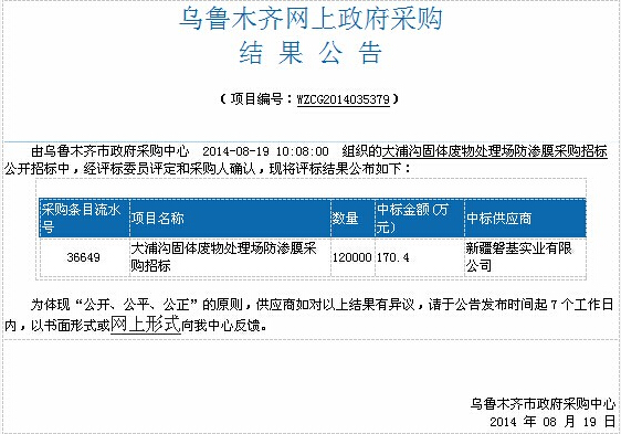 烏 魯 木 齊 網(wǎng) 上 政 府 采 購 結(jié)果公告 (項(xiàng)目編號:WZCG2014035379) 由烏魯木齊市政府采購中心2014-08-1910:08:00組織的大浦溝固體廢物處理場防滲膜采購招標(biāo)公開招標(biāo)中,經(jīng)評標(biāo)委員評定