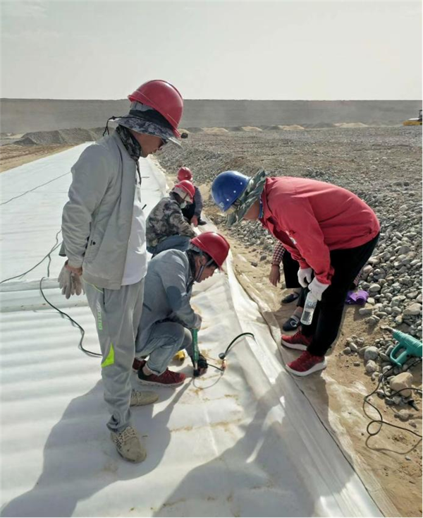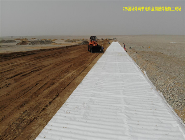 我公司于2020年5月中標(biāo)的兵團第十四師新建225團水利工程場外調(diào)節(jié)池工程為國家重點水利工程,工程等級為Ⅲ等中型水庫,全庫盤、壩坡、壩體均采用土工膜防滲。該項目重要材料標(biāo)段所使用的土工材料數(shù)量約610萬平方米。我公司于2021年11月完成供貨和鋪設(shè)焊接施工